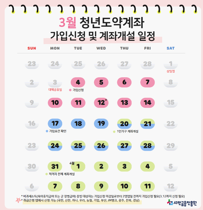 청년도약계좌 2025년 3월 가입 신청 및 계좌 개설 일정은 아래 그림과 같고, 자세한 일정은 서민금융진흥원사이트에서 바로 확인이 가능하십니다.