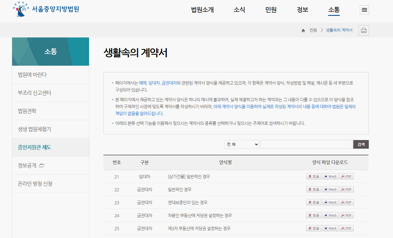 이에 필요한 차용증은 아래 사이트 [서울중앙지방법원/ 생활속의 계약서] 목록 2번, 3번에서 바로 무료로 다운로드가 가능하십니다.