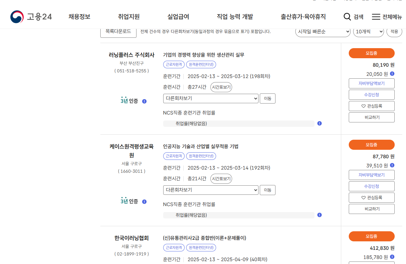 국민내일배움카드에 어떠한 훈련과정이 있는지는 고용 24 사이트에서 쉽게 확인이 가능하며 자부담 금액 등 자세한 내용을 바로 확인하여 수강신청까지 진행할 수 있습니다.