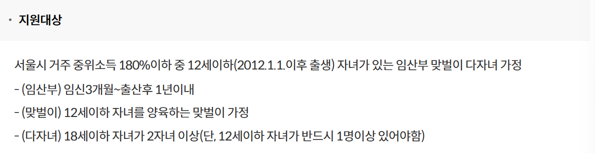 ✅ 지원 대상 확대: 기존 중위소득 85% 이하 → 서울시 거주 중위소득 180% 이하 가구도 신청 가능