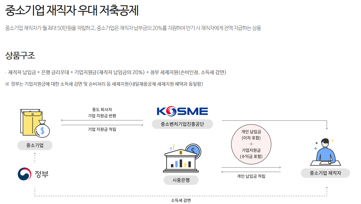 중소기업 재직자 우대 저축공제는 중소기업 재직자가 월 최대 50만원을 저축하고 중소기업이 20%의 재직자의 납부금을 지원하여 만기시 재직자가 전액 수령하여 목돈을 마련할 수 있습니다.